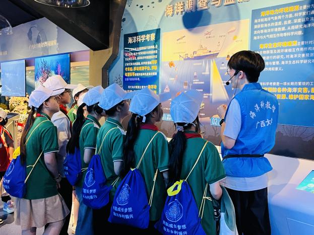 同学们来到广西大学,跟着志愿者“学姐”一起步行游览校园。在育才广场,听学姐讲解“梧州建校—桂林兴校—西迁榕江—南宁复校”的历史,巨幅时光轴和记录学校历史重大事件的浮雕等深深吸引了同学们,纷纷驻足拍照留念。