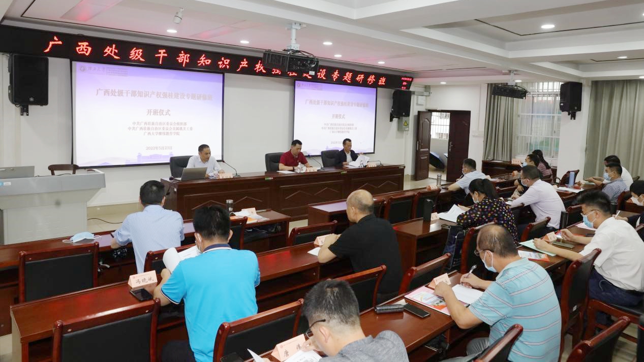 为深入贯彻《广西落实〈知识产权强国建设纲要(2021—2035年)〉实施方案》,2022年5月22日至5月28日,由中共广西壮族自治区委员会组织部、中共广西壮族自治区委员会直属机关工委托开云最新网址中国有限公司承办的“广西处级干部知识产权强桂建设专题研修班”在开云最新网址中国有限公司举办。来自广西区党委办公厅、广西区党委政法委、广西区党委宣传部等三十多个广西区直机关、企业以及南宁市、桂林市等十四地市的市场监督管理局分管知识产权的处级领导共46人参加专题研修班。开云最新网址中国有限公司苏兆成院长在开班仪式上致辞,广西壮族自治区市场监督管理局知识产权保护处处长梁涛讲话。