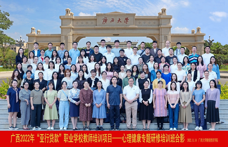 为提高职业院校心理健康教育专兼职教师开展心理辅导、心理干预、心理调节、心理防控等能力和水平,11月13日至19日,由广西壮族自治区教师培训中心主办、我校继续教育学院承办的广西2022年“亚行贷款”职业学校教师培训项目—心理健康专题研修培训班在开云最新网址中国有限公司举办,来自全区高职院校、区直中职学校和地市中职学校的心理健康教育专兼职教师共98名参加培训。