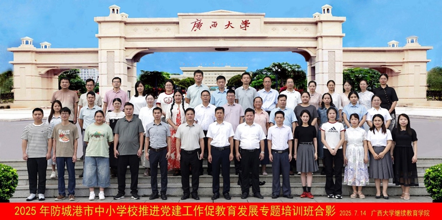 7月14日,2025年防城港市中小学校推进党建工作促教育发展专题培训班在广西大学开班。中共防城港市委教育工委专职副书记邱宽出席开班式并讲话。
